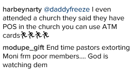 According to OAP Freeze, a young man sent him a screenshot of his mobile banking app which had apps of various Pentecostal churches on it, including Highlife Church. In one of the comments, someone even said they attended a church where they had POS in the church where one could use their ATM cards. Read what Freeze wrote after the cut..